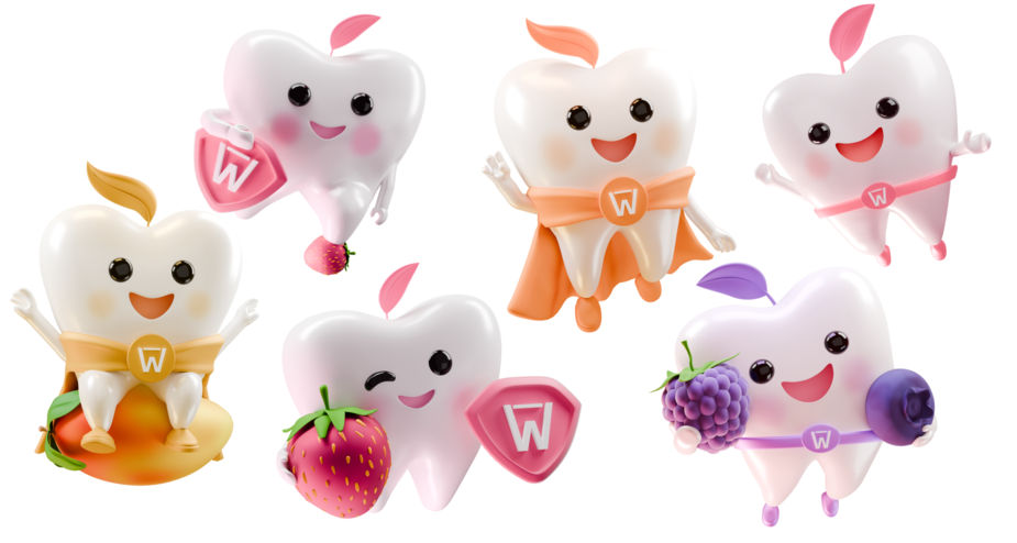 В основе концепции — персонажи, зубы-малыши, представленные с фруктами и ягодами, отражающими вкусы линейки. Мы переосмыслили предложенную идею с учетом физики и анатомии персонажей: проработали пластику форм, поведение материалов и светотень, чтобы персонажи выглядели живыми и органичными.