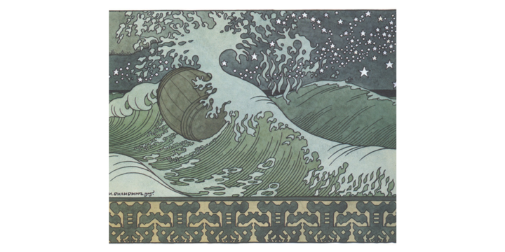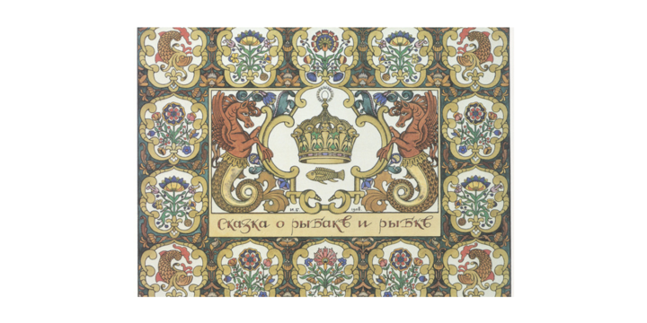 Увлечение фольклором предсказуемо привело Билибина к Пушкину. Оформленные им «Сказка о царе Салтане», «Сказка о золотом петушке» и «Сказка о рыбаке и рыбке» также сложились в подобие серии. Кроме страничных и разворотных иллюстраций, Билибин нарисовал для титульных листов монохромные фронтисписы, которые перекликаются с полноцветными рисунками внутри книги. Значимость этих рисунков и всего наследия Билибина ясна не сразу, но важно понимать, что именно он сформировал большинство наших визуальных стереотипов о Древней Руси и оставил в массовом сознании картину прошлого.