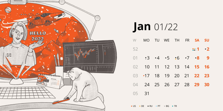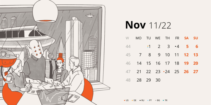 Иллюстрации для календаря – задача сезонная и всегда приуроченная к новому году, поэтому такие проекты мы любим особенно сильно. В этом раз мы сделали календарь для Devexperts на 2022 год с полным погружением в технологичное будущее!