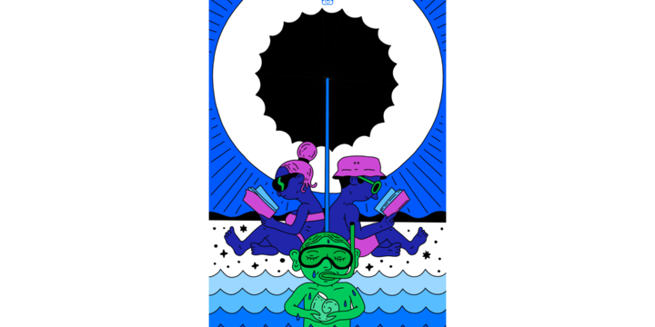 Пляжный отдых недооценен, поэтому Саша Блосяк нарисовал активность, которую иначе как тюленьей не назвать. Доступно везде, где песок, а не галька. Фанат экстрима на самой верхней точке горы тоже вышел в исполнении Саши.