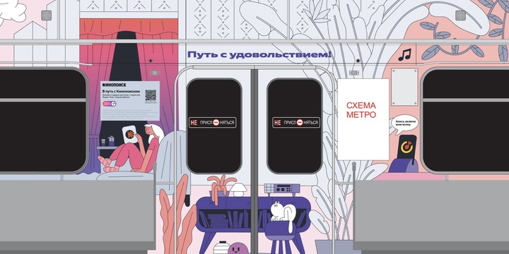 Для работы была предоставлена растяжка цветов Плюса: от оранжевого через розовый к фиолетовому, цвета можно было брать только из этой палитры. Я старалась использовать более светлые оттенки, чтобы избежать давящего темного ощущения от вагона — получилось довольно нежно».
